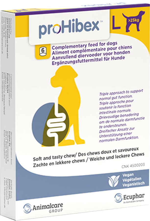 proHibex Large sú chutné žuvacie maškrty pre psov na podporu normálnej funkcie čriev, konzistentnú stolicu, podporu črevnej mikroflóry a zdravie buniek. Obsahujú úplne nové probiotikum Bacillus velezensis, betaglukány, inulín, íl, vitamíny a minerály.